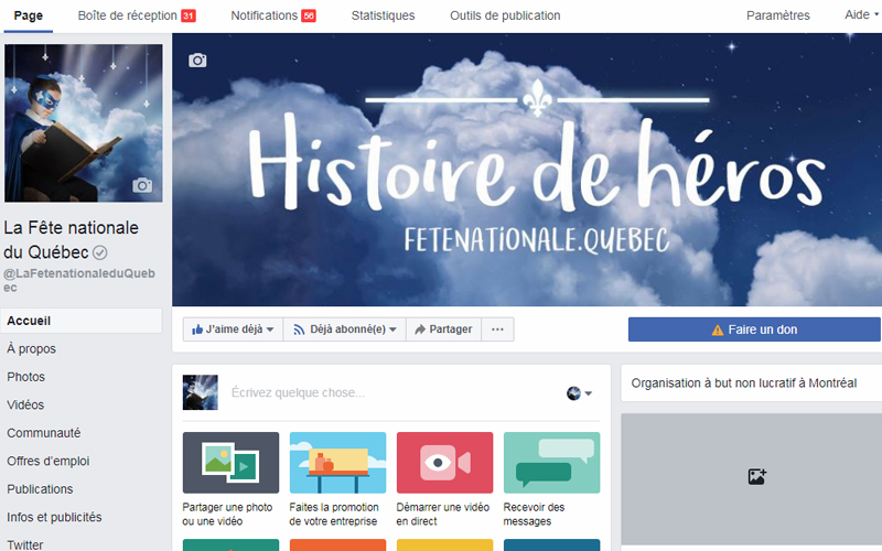 Les réseaux sociaux occupent une place de plus en plus importante dans les communications de la Fête nationale. En nous permettant de joindre une clientèle beaucoup plus vaste que sur les médias traditionnels, la page Facebook de la Fête nationale nous offre un contact direct avec la population et nous aide ainsi à faire la promotion des festivités et des activités tant au niveau local, régional que national. La page compte aujourd’hui plus de 53 000 abonnés. Le réseau développé avec les 18 mandataires régionaux permet notamment de tisser une impressionnante toile de diffusion de l’information. À titre d’exemple, la publicité nationale a été partagée plus de 1 500 fois et compte plus de 72 000 visionnements tandis que le concours « Les bières du Québec, notre fierté nationale » a atteint 213 402 personnes, a engendré 36 779 réactions sur la publication, dont 5 342 partages.